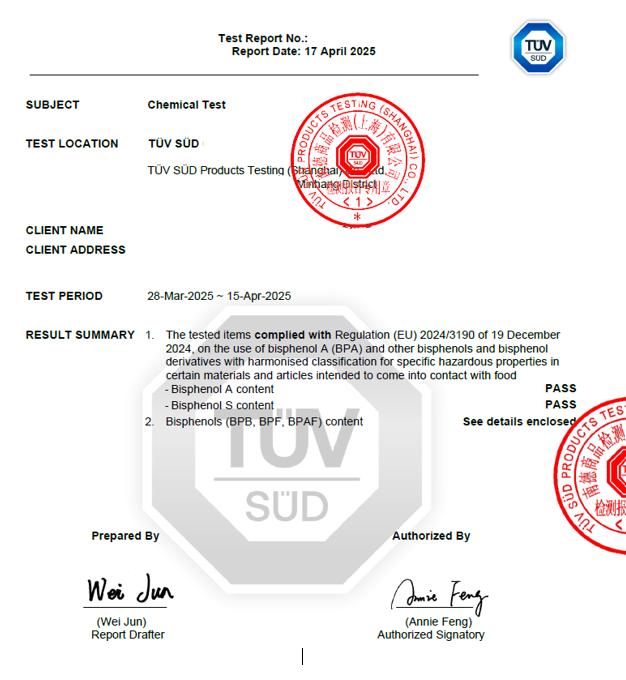 Compliance with EU 2024/3190: ผ่านการรับรองตามกฎระเบียบสหภาพยุโรปฉบับใหม่ล่าสุด ซึ่งมีความเข้มงวดสูงสุดในเรื่องความปลอดภัยของวัสดุสัมผัสอาหาร